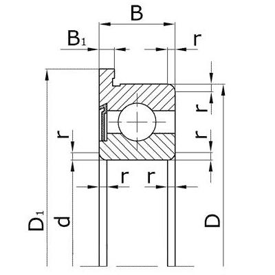 Направление воспринимаемых нагрузок – радиальное и осевое в обе стороны. Осевое – до 70% неиспользованной допустимой радиальной нагрузки. Наличие упорного борта на наружном кольце позволяет производить сквозную обработку отверстий корпуса под посадку наружных колец.